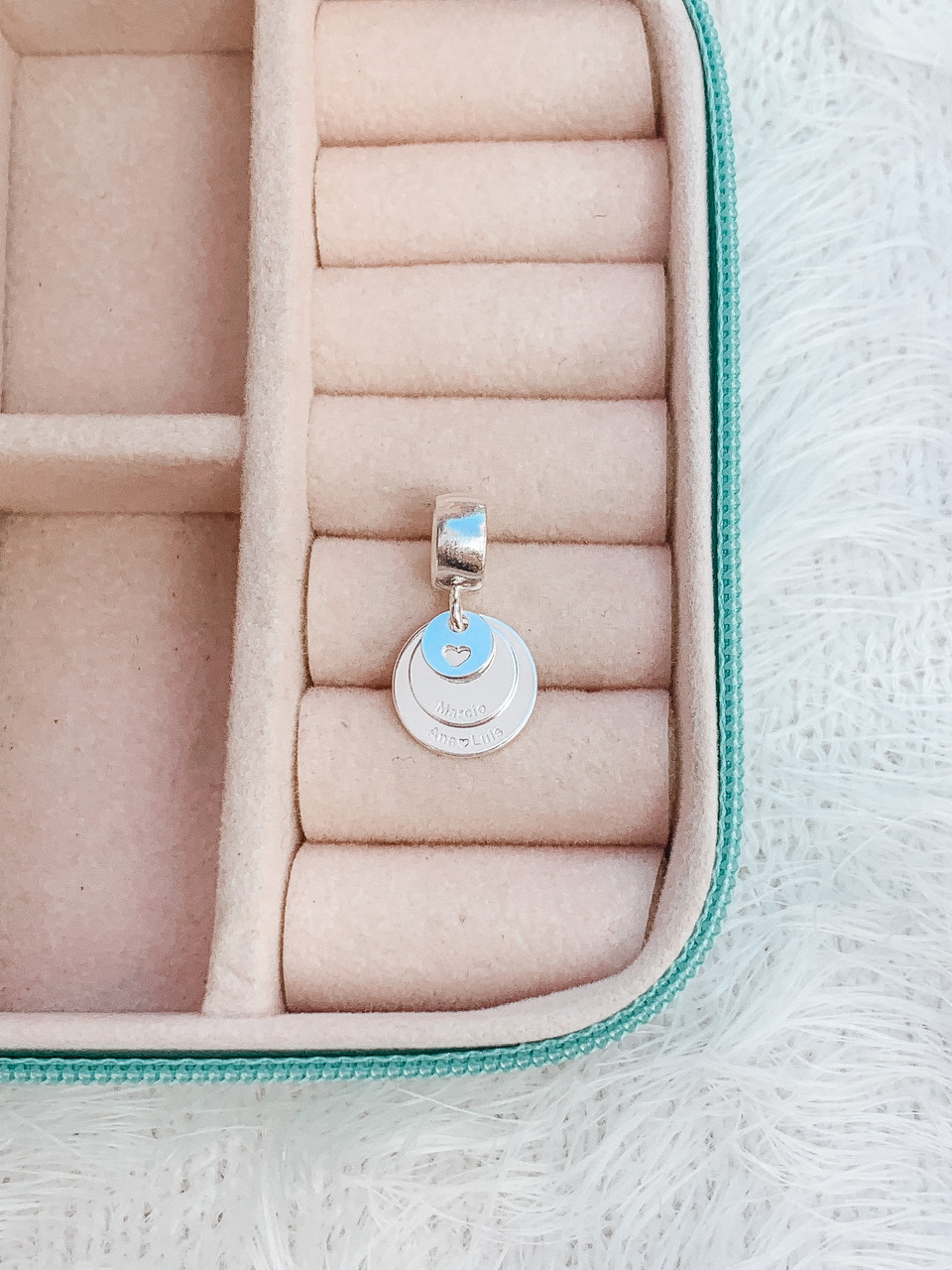 Nosso berloque com medalhas é uma joia personalizada que pode conter até 13 letras na medalha média e 15 letras na medalha grande, a medalha pequena não é personalizável sendo mantido sempre o coração vazado, o prazo de produção é de até 45 dias úteis para ficar pronto e ser entregue.