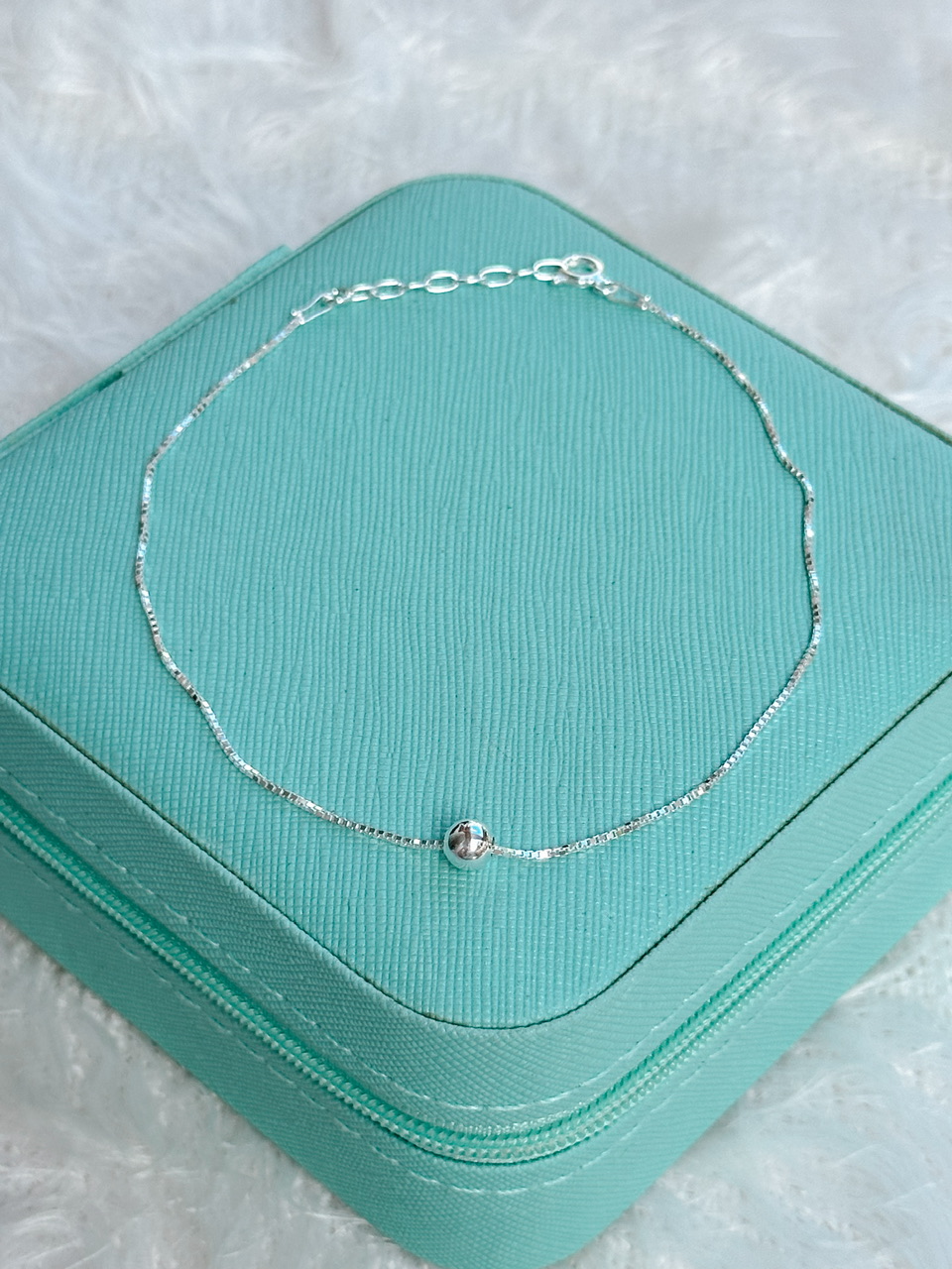 Uma tornozeleira confeccionada em prata 925 e o certificado de autenticidade.
